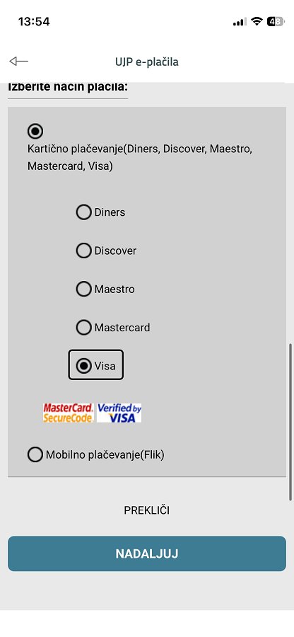 - Kartica (Visa, Mastercard, Maestro …)