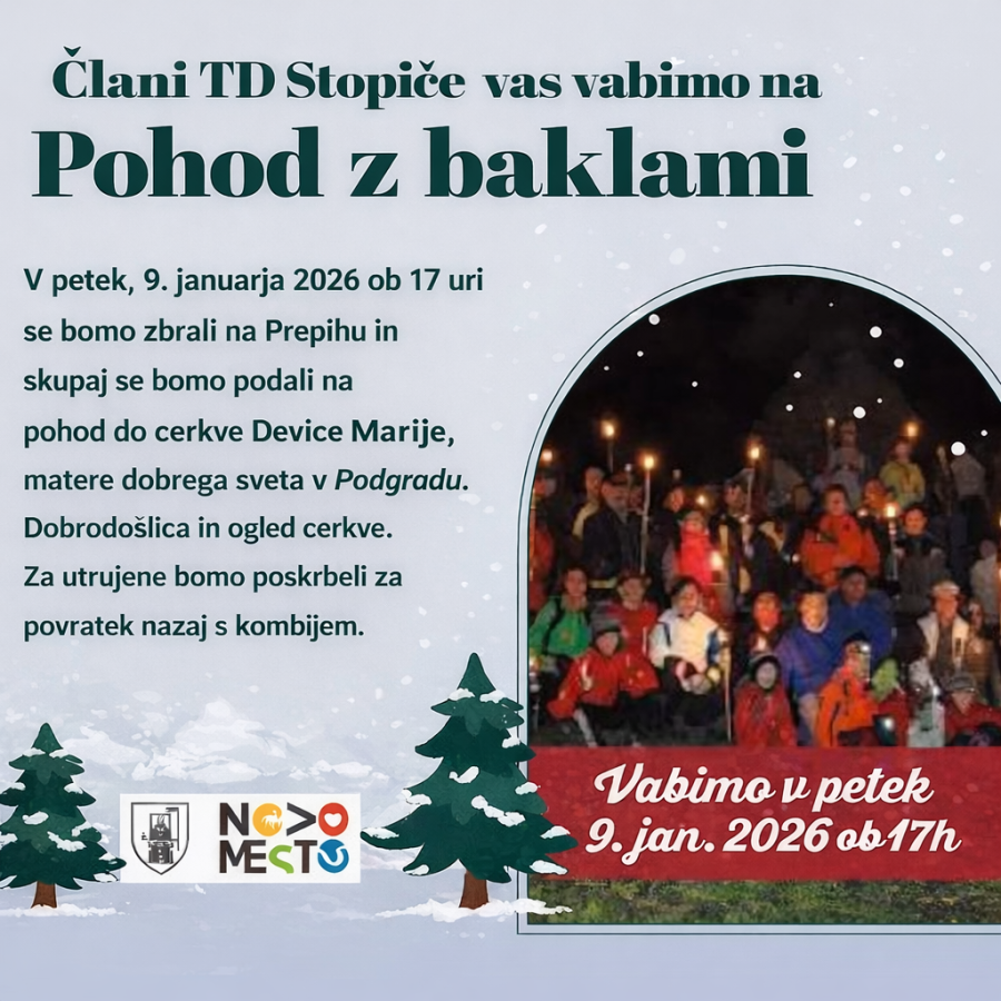 Vljudno vabljeni, v petek 9. januarja 2026 ob 17.00 uri na tradicionalni pohod z baklami. Zbrali se bomo pri restavraciji Prepih in se bomo po zasneženih poteh odpravili do Podgrada, kjer si bomo ogledali cerkev Matere dobrega sveta. Za utrujene bo poskrbljen prevoz nazaj do restavracije Prepih s kombijem.