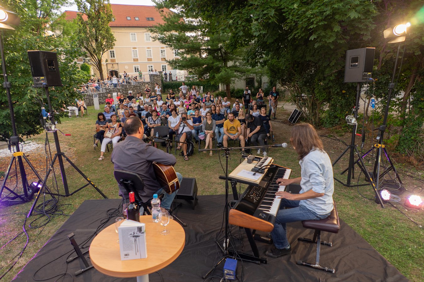 Na včerajšnjem večeru sta v Parku Rastoče knjige v sklopu Festivala novomeško poletje za smeh in dobro glasbo poskrbela Dimek in Davor Klarić, sicer člana glasbene skupine Mi2, ki sta v akustični izvedbi pred zavidljivim številom poslušalcev govorila in pela o vinu, prijateljstvu in ljubezni.